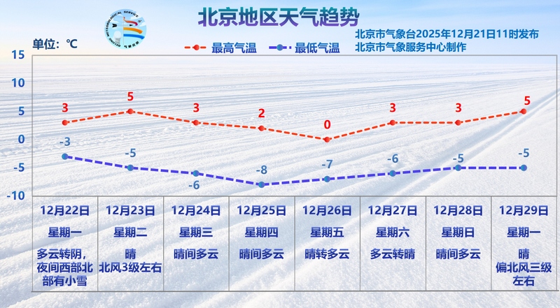 未來(lái)一周,北京仍以晴到多云為主,氣溫持續(xù)在低位徘徊,白天氣溫在0℃至5℃之間,夜間氣溫-3℃至-8℃。
