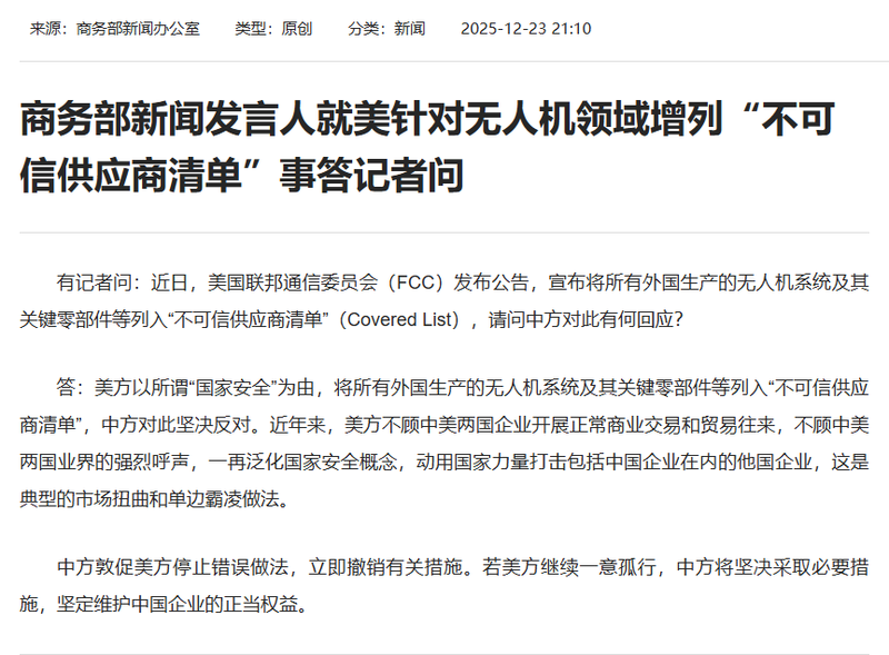 新京報(bào)訊 據(jù)商務(wù)部網(wǎng)站消息,商務(wù)部新聞發(fā)言人就美針對無人機(jī)領(lǐng)域增列“不可信供應(yīng)商清單”事答記者問。