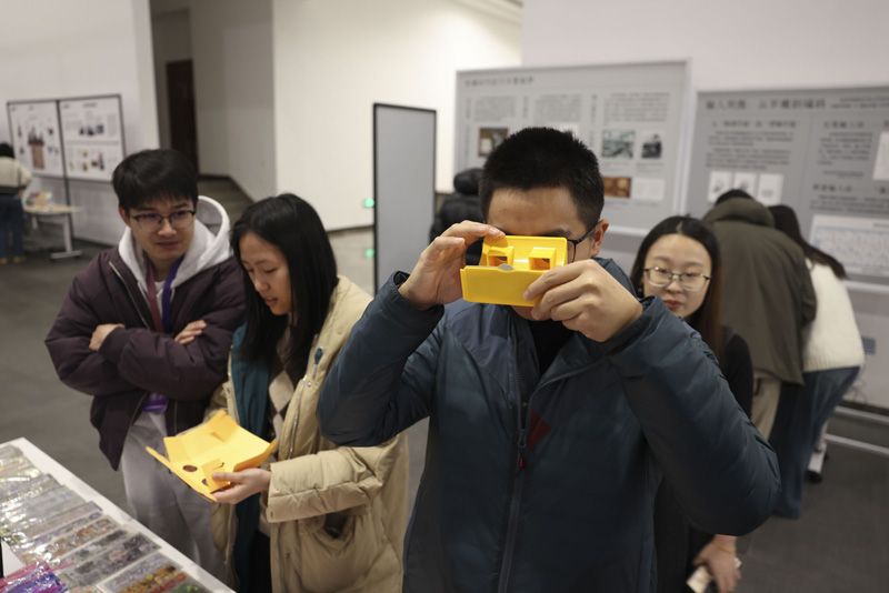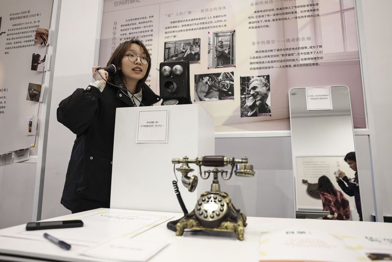 12月23日,“媒介進化論”暨博物館課堂教學(xué)成果展在清華大學(xué)科學(xué)博物館開幕。本次展覽是清華大學(xué)研究生課程《媒介發(fā)展史》的教學(xué)改革成果,匯聚了2024年秋和2025年秋兩個學(xué)年49名選課同學(xué)的15件作品。圖為學(xué)生見證壁掛電話、桌面電話到移動手機的技術(shù)演變。