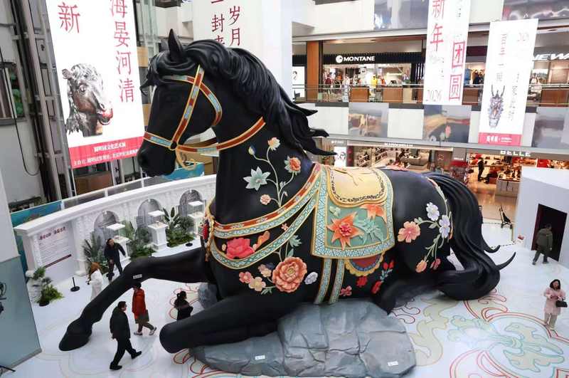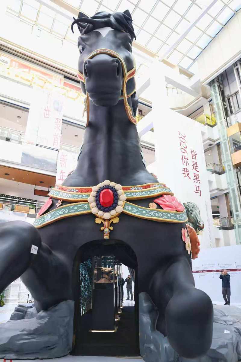 新京報(bào)訊(記者吳為)12月23日,一匹3層樓高的黑色“巨馬”亮相北京世紀(jì)金源購(gòu)物中心2層中庭,為人們帶來(lái)新年的祝福?!熬揆R”的設(shè)計(jì)靈感直接源自圓明園館藏文物——馬首銅像。當(dāng)天,“獸首迎新 海晏河清——圓明園文化藝術(shù)展”于北京世紀(jì)金源購(gòu)物中心正式面向公眾開(kāi)放。