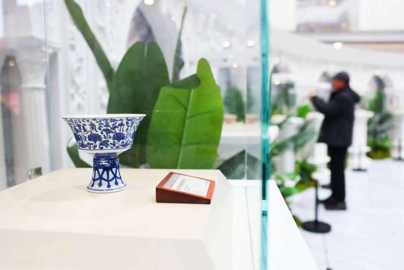 展出的圓明園“修復(fù)1860”項(xiàng)目重現(xiàn)光彩的乾隆梵文青花高足碗等瓷器復(fù)制品。新京報(bào)記者 浦峰 攝