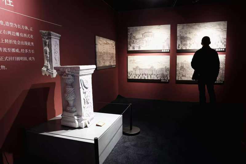 現(xiàn)場(chǎng)展出象征文物回歸歷程的西洋樓漢白玉石柱復(fù)制品。新京報(bào)記者 浦峰 攝