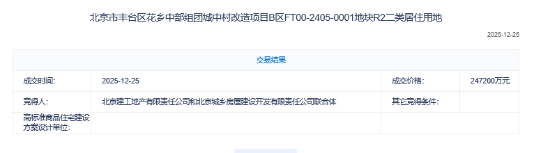 12月25日,豐臺區(qū)花鄉(xiāng)街道0001地塊(下稱“花鄉(xiāng)地塊”)以平淡收場,為2025年北京土地市場畫上句號。該地塊由北京建工聯(lián)合城鄉(xiāng)開發(fā)以底價24.72億元斬獲,成交樓面價4.2萬元/平方米。
