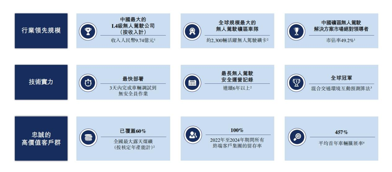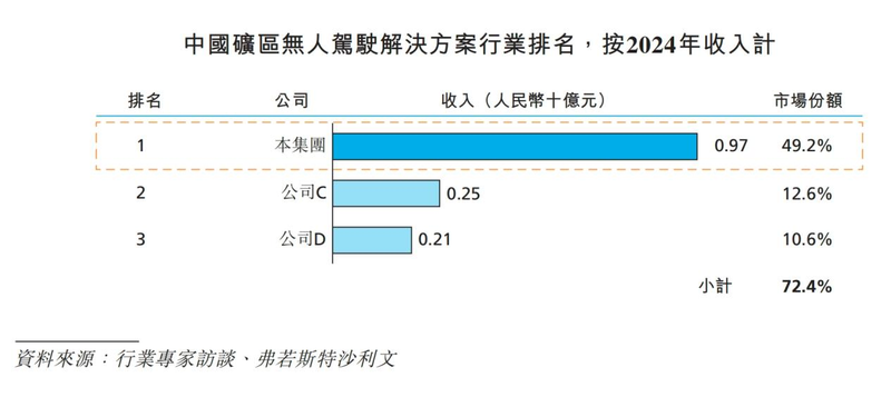 2024 年,公司實(shí)現(xiàn)總收入9.86億元,在中國(guó)所有L4級(jí)無(wú)人駕駛公司中排名第一;同時(shí),公司是中國(guó)最大的礦區(qū)無(wú)人駕駛解決方案提供商,在該市場(chǎng)份額約為 49.2%;而按同期收入計(jì),中國(guó)作為全球最大的L4級(jí)礦區(qū)無(wú)人駕駛解決方案市場(chǎng),其全球市占率超過(guò)40.5%。