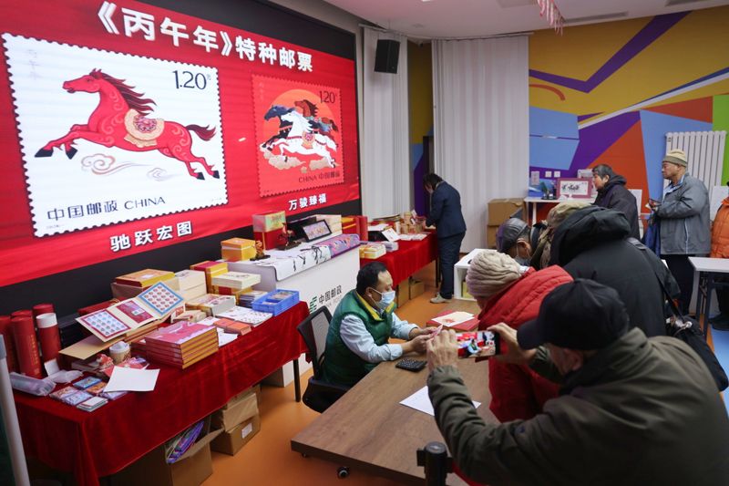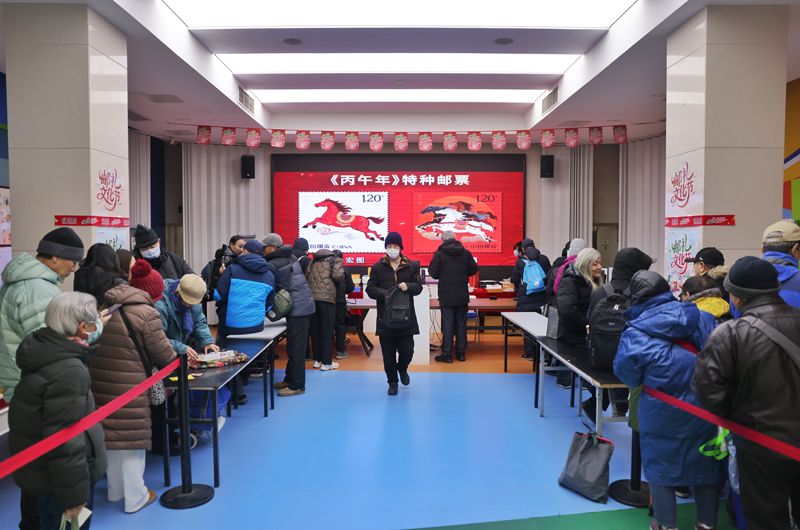 1月5日, 中國(guó)郵政《丙午年》特種郵票正式上市發(fā)售。清晨8時(shí),朝陽區(qū)郵票公司營(yíng)業(yè)部提前1小時(shí)開門,迎來第一批購(gòu)買馬年生肖郵票的郵迷。