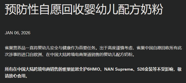 1月6日,雀巢中國官網(wǎng)同樣發(fā)布了2條預(yù)防性召回公告,稱出于高度謹(jǐn)慎考慮,雀巢中國自愿回收所有此次涉事的進(jìn)口自歐洲、在中國大陸跨境電商渠道銷售的嬰幼兒配方奶粉,共計(jì)41批次;同時(shí)自愿回收在中國大陸銷售的特定批次嬰幼兒配方奶粉,共30批次。