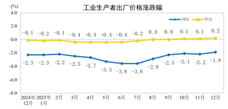 1月9日,國家統(tǒng)計局公布數據顯示,2025年12月份,居民消費價格指數(CPI)環(huán)比上漲0.2%,同比上漲0.8%,扣除食品和能源價格的核心CPI同比上漲1.2%,漲幅連續(xù)4個月保持在1%以上。工業(yè)生產者出廠價格指數(PPI)環(huán)比上漲0.2%,同比下降1.9%。