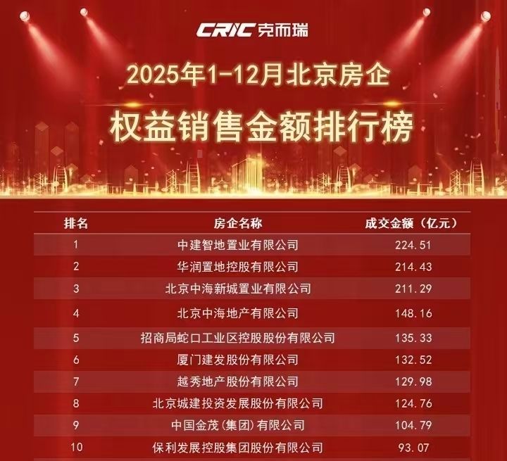 根據(jù)克而瑞榜單,2025年,中建智地、華潤置地、中海新城三家權(quán)益銷售額超過200億,另外還有北京中海、招商蛇口、建發(fā)股份、越秀地產(chǎn)、北京城建、中國金茂六家房企權(quán)益銷售額超過100億。