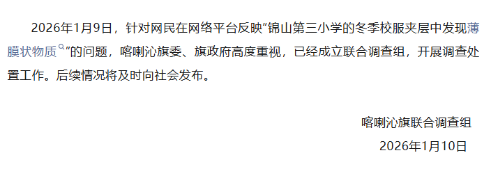 新京報(bào)訊 1月10日,內(nèi)蒙古赤峰市喀喇沁旗聯(lián)合調(diào)查組發(fā)布情況通報(bào),2026年1月9日,針對(duì)網(wǎng)民在網(wǎng)絡(luò)平臺(tái)反映“錦山第三小學(xué)的冬季校服夾層中發(fā)現(xiàn)薄膜狀物質(zhì)”的問(wèn)題,喀喇沁旗委、旗政府高度重視,已經(jīng)成立聯(lián)合調(diào)查組,開(kāi)展調(diào)查處置工作。后續(xù)情況將及時(shí)向社會(huì)發(fā)布。