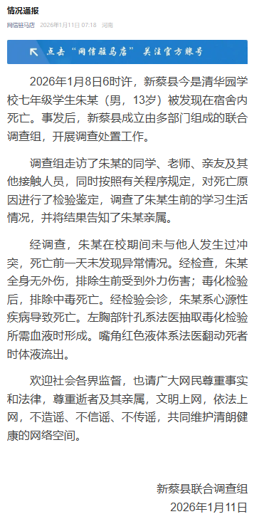新京報(bào)訊 1月11日,河南新蔡縣聯(lián)合調(diào)查組發(fā)布情況通報(bào),2026年1月8日6時(shí)許,新蔡縣今是清華園學(xué)校七年級(jí)學(xué)生朱某(男,13歲)被發(fā)現(xiàn)在宿舍內(nèi)死亡。事發(fā)后,新蔡縣成立由多部門組成的聯(lián)合調(diào)查組,開展調(diào)查處置工作。