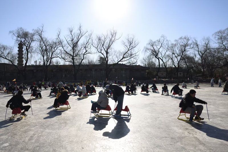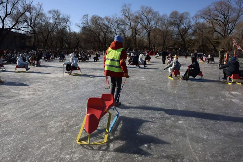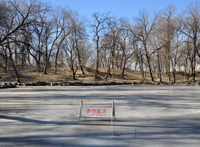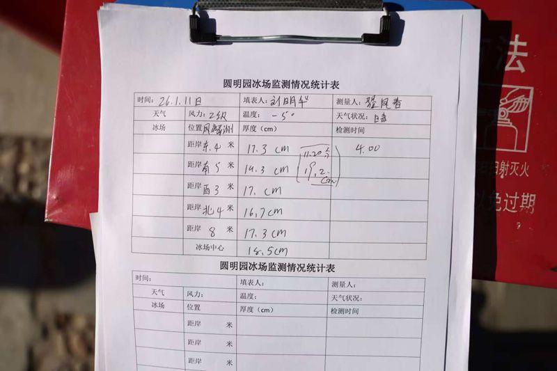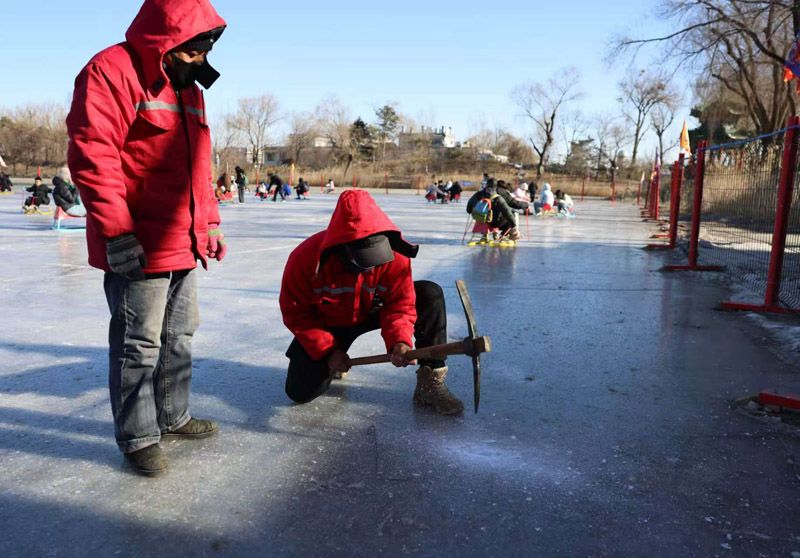 1月11日,圓明園鳳麟洲冰場,工作人員鑿冰洞準備測量冰層厚度?!叭拧苯蹬R,北京各冰場逐步開放。記者探訪全市最早開放的圓明園冰場,聚焦其安全管理措施。