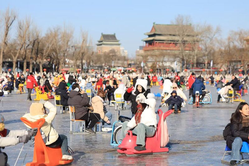 1月11日,什剎海前海冰場首個周末就人氣爆棚。冰上自行車、冰車、冰上小龍舟等近2000套裝備已供不應(yīng)求。經(jīng)過西城區(qū)體育局等單位組織的聯(lián)合驗(yàn)冰,確認(rèn)前海冰場厚度達(dá)標(biāo)、各項(xiàng)安全措施完備,1月10日什剎海前海冰場正式開業(yè)。
