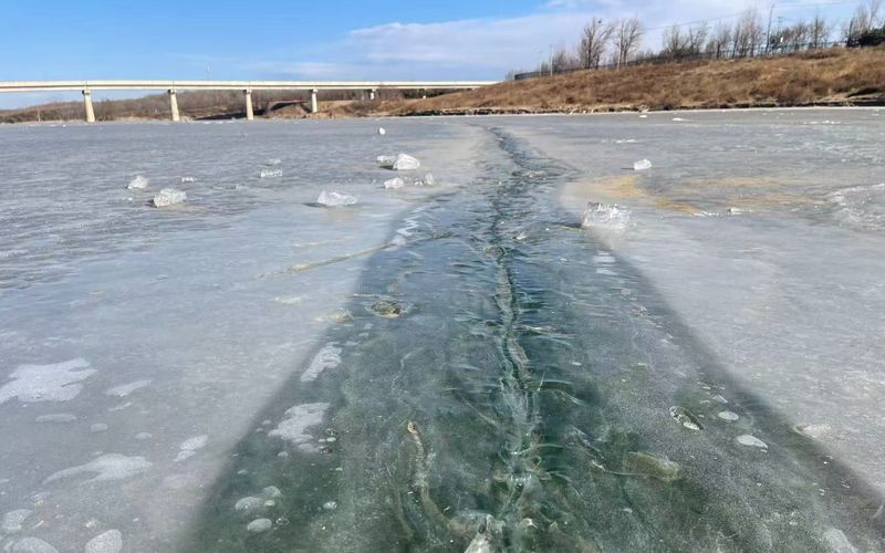 記者踩著冰面小心翼翼地往河道中心行走,腳下是透著裂縫的冰層,如果冰面破裂,四周一點(diǎn)抓、扶的可能性都沒(méi)有。另外,這里水面寬闊,一旦發(fā)生危險(xiǎn),救援難度極大。