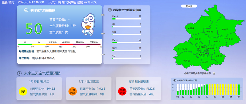 據(jù)北京市生態(tài)環(huán)境監(jiān)測中心今早7時數(shù)據(jù),目前實時空氣質(zhì)量指數(shù)50,空氣質(zhì)量優(yōu)。