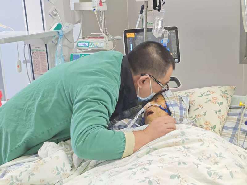 1月2日,母親病情惡化時(shí),黃海樂親吻她的額頭,希望傳遞愛的力量。受訪者供圖