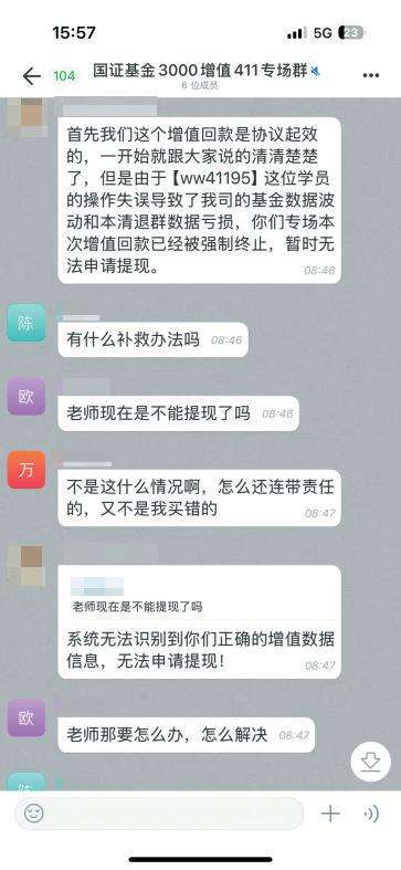 在對方表示“因?yàn)槠渌麑W(xué)員操作失誤導(dǎo)致后臺數(shù)據(jù)亂,需要再買8萬+3萬的階梯式基金,群里的4位學(xué)員一起修復(fù)”后,其余“學(xué)員”都表現(xiàn)得非常焦急。“我當(dāng)時(shí)也覺得11萬太多了,但是看到別人已經(jīng)付完款,自己如果不買會(huì)影響到所有人提現(xiàn),就還是決定要繼續(xù)做下去?!?/p>