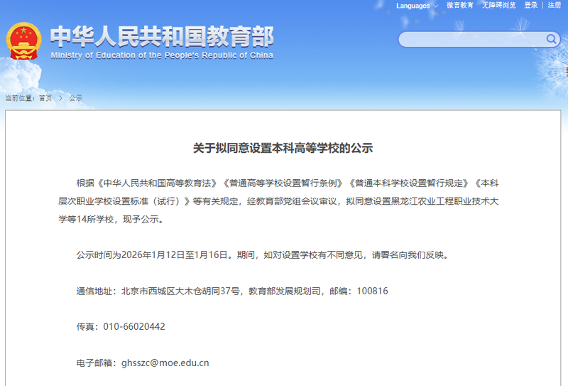 根據《中華人民共和國高等教育法》《普通高等學校設置暫行條例》《普通本科學校設置暫行規(guī)定》《本科層次職業(yè)學校設置標準(試行)》等有關規(guī)定,經教育部黨組會議審議,擬同意設置黑龍江農業(yè)工程職業(yè)技術大學等14所學校,現(xiàn)予公示。公示時間為2026年1月12日至1月16日。