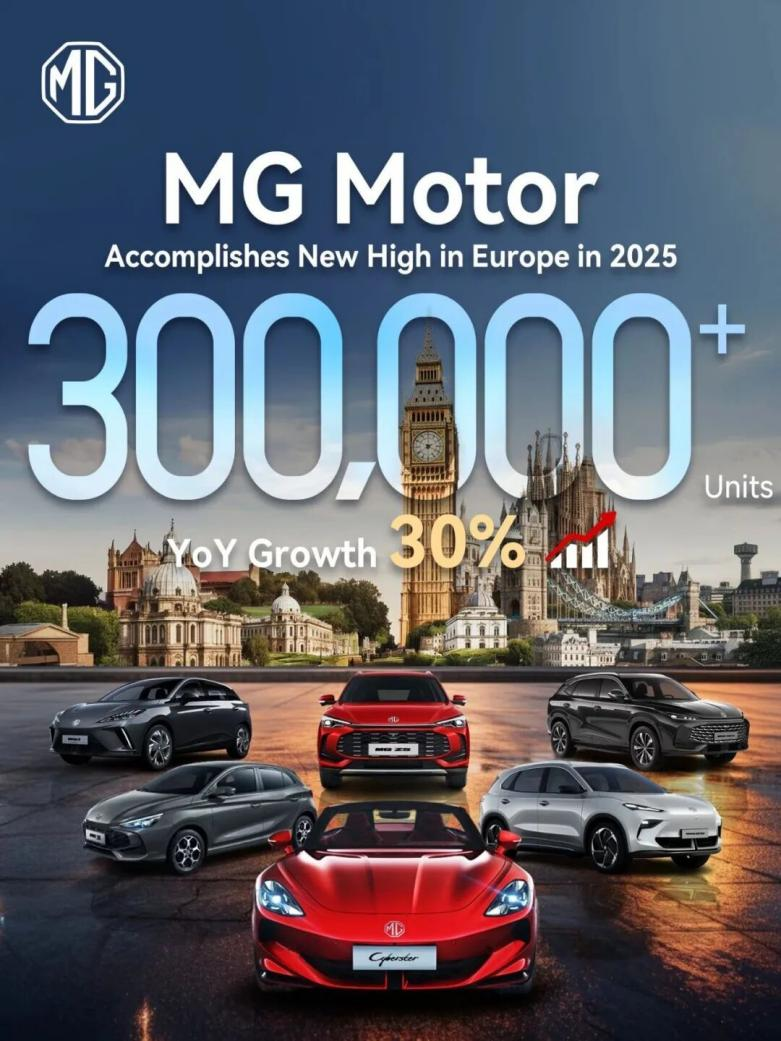 在國內(nèi)市場,MG展現(xiàn)出強勁的復(fù)蘇勢頭。截至2025年11月,其國內(nèi)累計銷量已達11.6萬輛,超過2024年全年總和。與此同時,MG在海外市場同樣高歌猛進:2025年上半年,它在歐洲市場的銷量首次超越特斯拉,以15.3萬輛的成績,成為歐洲最暢銷的中國汽車品牌;全年在歐英市場的總銷量更是一舉突破30萬輛大關(guān),成為首家達成這一成就的中國車企。