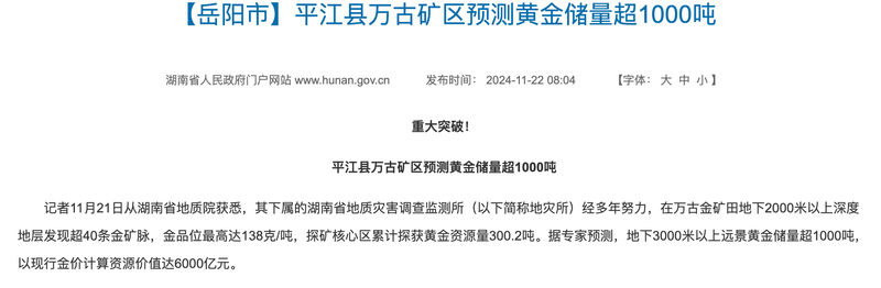 2024年11月下旬,湖南省地質(zhì)院公布湖南平江縣萬古金礦田探礦獲重大突破,在萬古金礦田地下2000米以上深度地層發(fā)現(xiàn)超40條金礦脈,金品位最高達(dá)138克/噸,探礦核心區(qū)累計探獲黃金資源量300.2噸。專家會商認(rèn)為,湘東萬古金礦田礦床規(guī)模屬于超大型,預(yù)測地下3000米以上遠(yuǎn)景黃金儲量超1000噸,以當(dāng)時金價計算資源價值達(dá)6000億元。