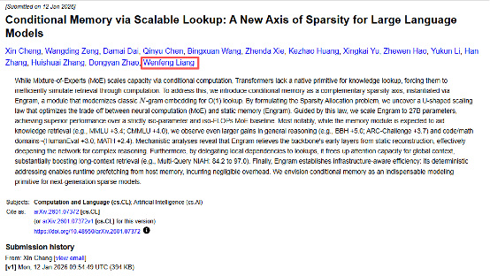 1月12日晚間,DeepSeek發(fā)布梁文鋒署名的新論文,主題為《Conditional Memory via Scalable Lookup:A New Axis of Sparsity for Large Language Models》(直譯為基于可擴(kuò)展查找的條件記憶:大語(yǔ)言模型稀疏性的新維度),這也是2026開(kāi)年至今,DeepSeek團(tuán)隊(duì)的第二篇重磅論文。