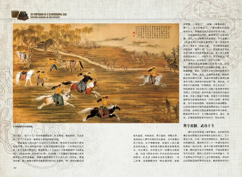 乾隆帝從皇祖康熙帝和皇父雍正帝手中繼承了一個(gè)政體完備、運(yùn)轉(zhuǎn)高效的帝國(guó),勤政不輟,為政可稱明君,內(nèi)民生繁華,外靖邊宣武,同時(shí)嚴(yán)守祖制、研書(shū)敷文、匡正禮樂(lè),完成了滿清王朝在文化正統(tǒng)上的構(gòu)建。在藝術(shù)上又有著鮮明的個(gè)人喜好與追求。