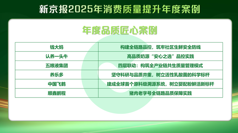 歷時一個多月的征集與評選,有29家政府部門、企業(yè)團(tuán)體最終入選“消費(fèi)質(zhì)量提升年度案例”。其中,北京市東城區(qū)文旅局、北京市朝陽區(qū)商務(wù)局、泉州市文化廣電和旅游局、伊利集團(tuán)等9家企業(yè)入選“年度社會責(zé)任案例”;錢大媽、認(rèn)養(yǎng)一頭牛、五糧液集團(tuán)、養(yǎng)樂多、中國飛鶴、順鑫鵬程等6家企業(yè)入選“年度品質(zhì)匠心案例”;君樂寶乳業(yè)集團(tuán)、美贊臣、蘇州稻香村集團(tuán)、燕京啤酒、茶百道等14家企業(yè)入選“年度創(chuàng)新實(shí)踐案例”。