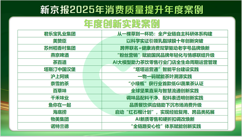 1月15日,新京報宣布成立消費(fèi)研究院并舉行首屆年會。經(jīng)過一個多月的征集與評選,共有29家政府部門、企業(yè)團(tuán)體在本次年會上入選“消費(fèi)質(zhì)量提升年度案例”,其中包括9個“年度社會責(zé)任案例”、6個“年度品質(zhì)匠心案例”和14個“年度創(chuàng)新實(shí)踐案例”。這些年度案例不僅在各自領(lǐng)域取得了出色成績與社會認(rèn)可,更為“十五五”期間行業(yè)持續(xù)健康發(fā)展提供了可參考樣本。