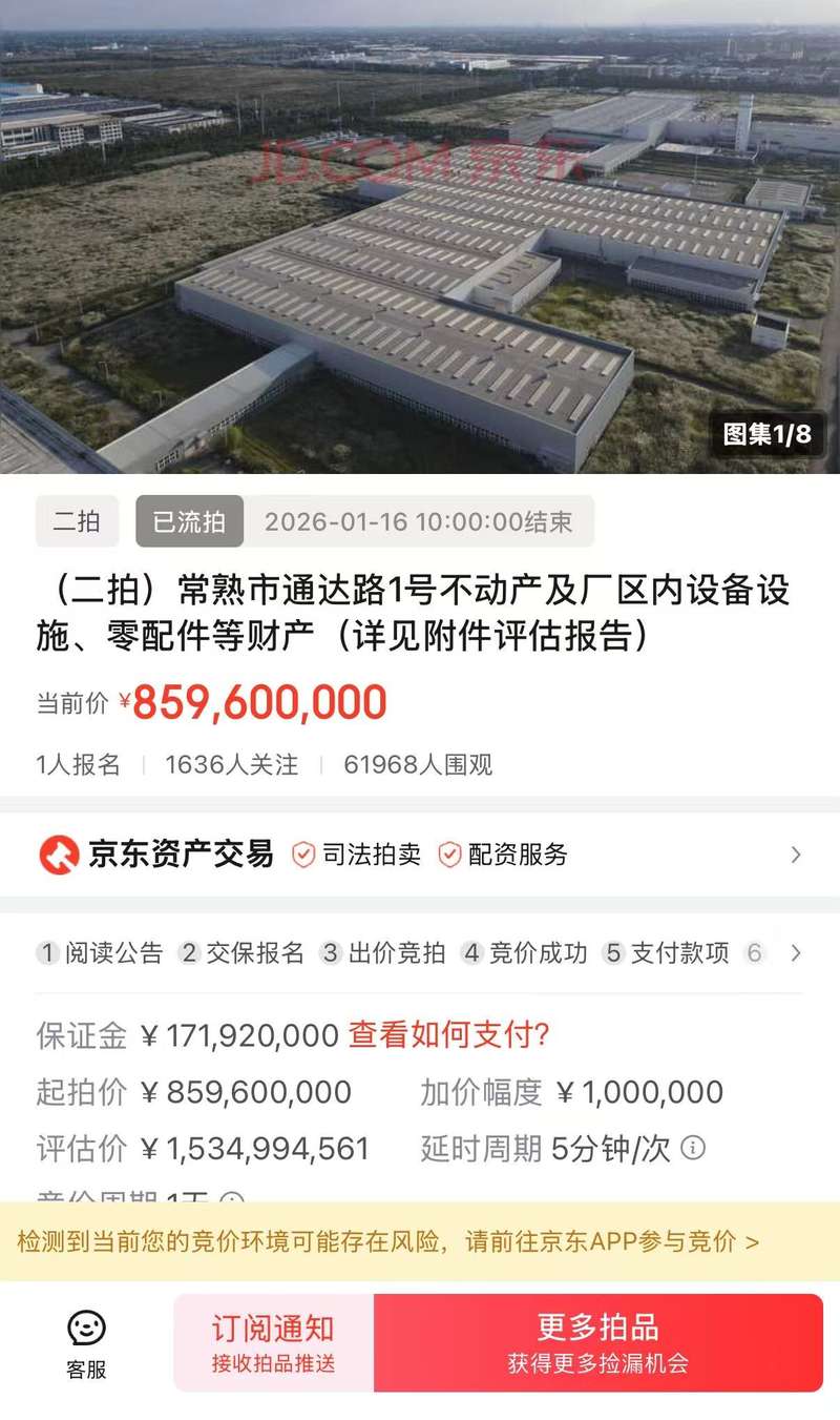 1月15日上午10時(shí),觀致汽車工廠正式開始拍賣。這場拍賣的起拍價(jià)格是8.596億元,參與拍賣需要付保證金1.719億元,加價(jià)幅度為100萬元。該資產(chǎn)評估價(jià)格為15億元左右。