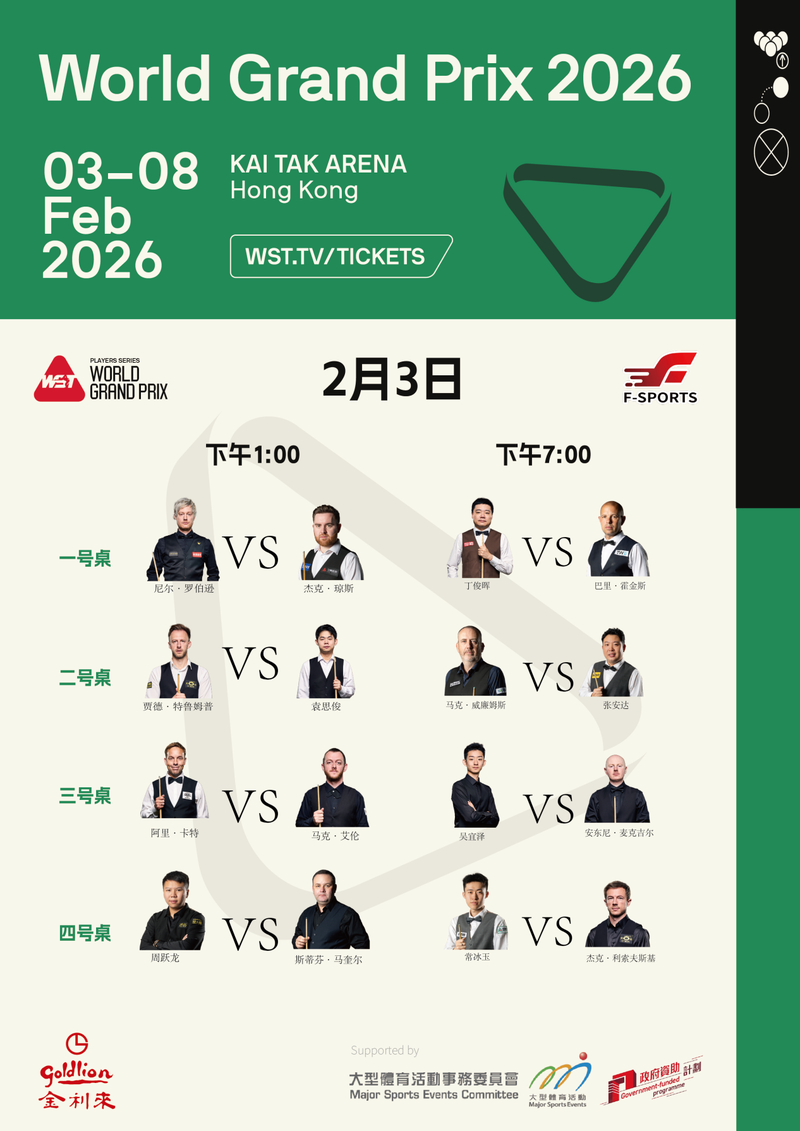 圖為2026斯諾克世界大獎(jiǎng)賽2月3日對(duì)陣圖