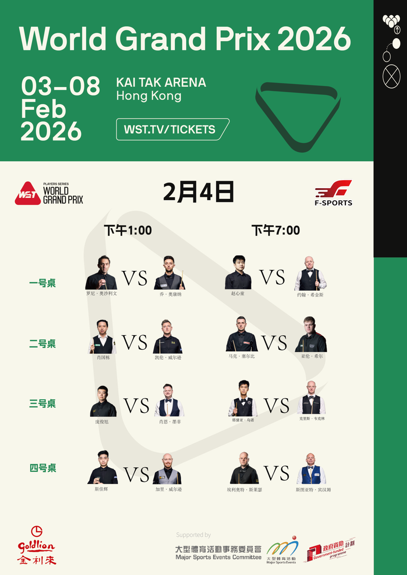 圖為2026斯諾克世界大獎(jiǎng)賽2月4日對(duì)陣圖