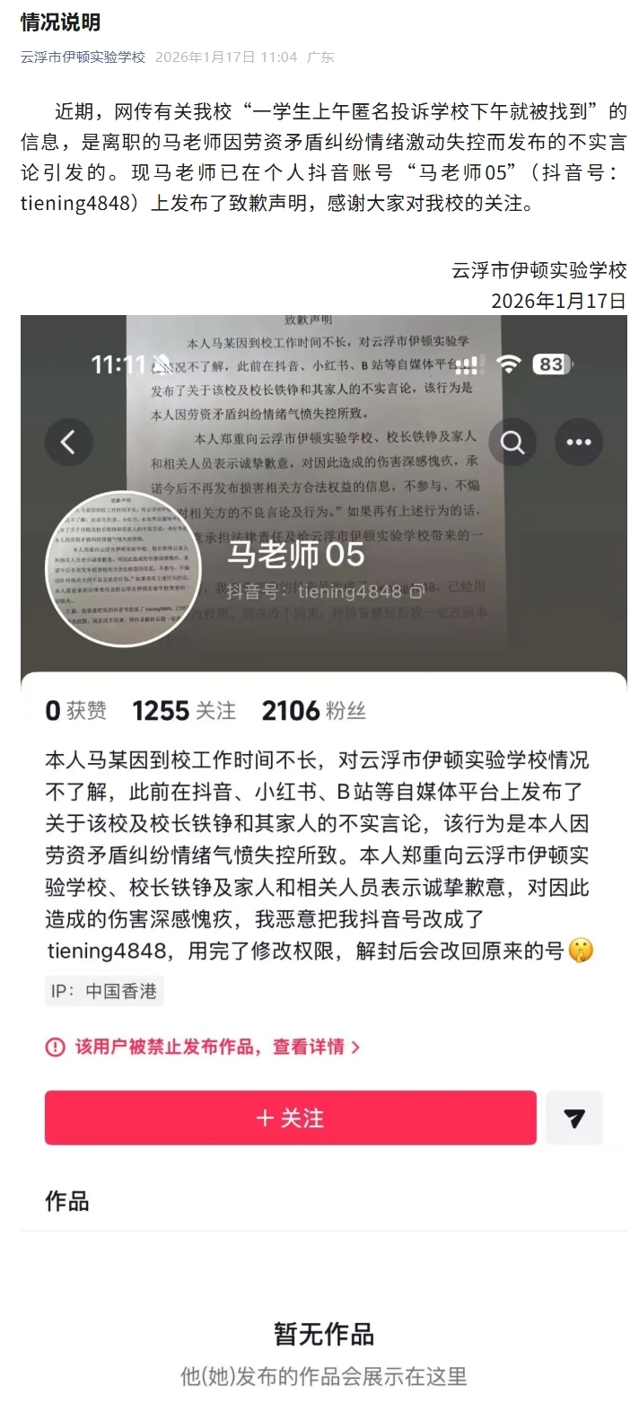近期,網(wǎng)傳有關(guān)該?!耙粚W(xué)生上午匿名投訴學(xué)校下午就被找到”的信息,是離職的馬老師因勞資矛盾糾紛情緒激動(dòng)失控而發(fā)布的不實(shí)言論引發(fā)的。現(xiàn)馬老師已在個(gè)人抖音賬號(hào)“馬老師05”(抖音號(hào):tiening4848)上發(fā)布了致歉聲明,感謝大家對(duì)學(xué)校的關(guān)注。