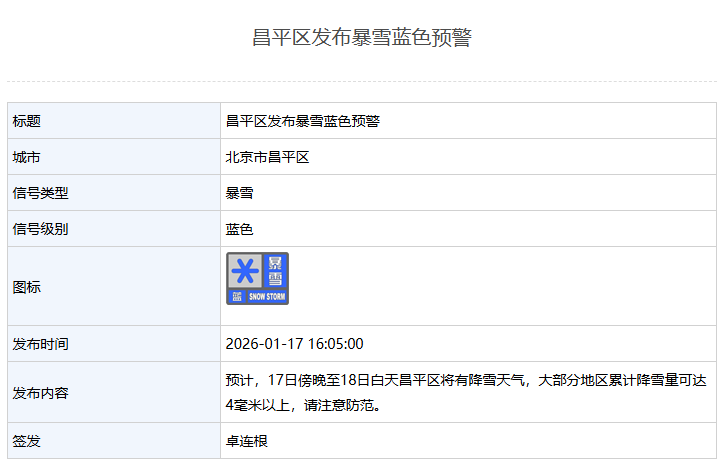 昌平區(qū)發(fā)布暴雪藍(lán)色預(yù)警