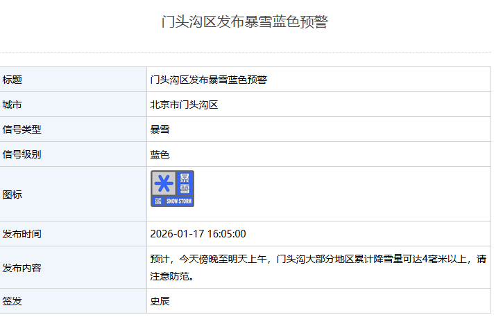 門頭溝區(qū)發(fā)布暴雪藍(lán)色預(yù)警