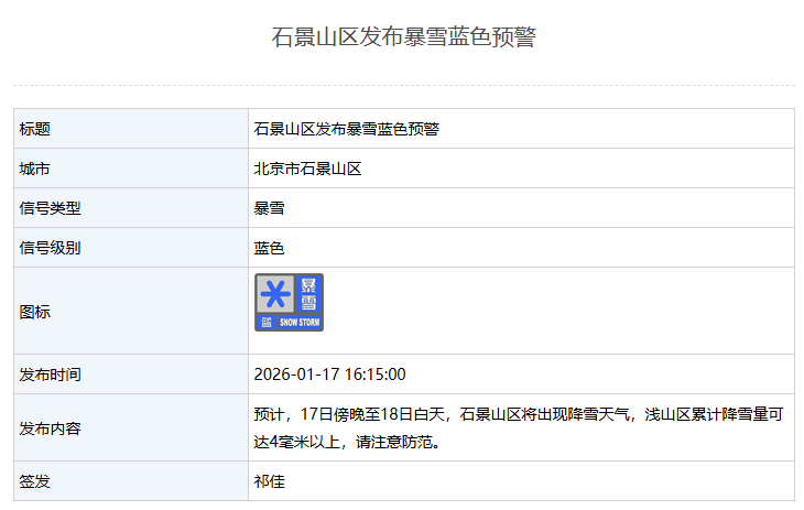石景山區(qū)發(fā)布暴雪藍(lán)色預(yù)警