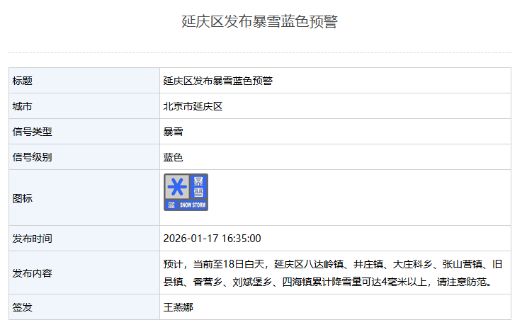 延慶區(qū)發(fā)布暴雪藍(lán)色預(yù)警