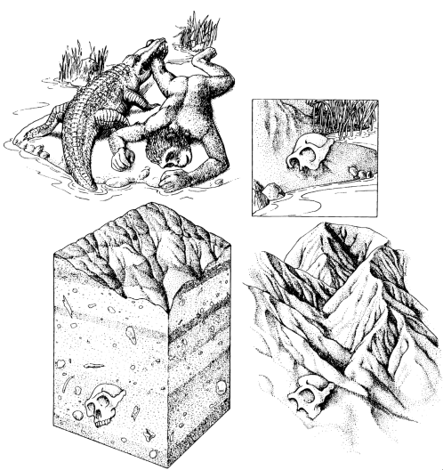化石的生命歷史。動(dòng)物死后,尸體大部分會(huì)被捕食者或者食腐動(dòng)物吞食(左上)。殘骸要么被風(fēng)化,要么被累積的沉淀物掩埋(右上)。條件適當(dāng)時(shí),這些殘骸會(huì)逐漸石化,因?yàn)樗鼈兊慕M成部分會(huì)被得自周圍巖石中的礦物質(zhì)取代(左下)。如果上層沉積物被侵蝕和磨損,化石就會(huì)重新暴露在地表(右下),在自然力量還未摧毀它之前,人們一定會(huì)在該地找到它。圖畫作者:戴安娜·薩勒斯,出自伊恩·塔特索爾:《人類奧德賽》(1993)?!妒澜缧鱅:從起源到公元前4000年》插圖
