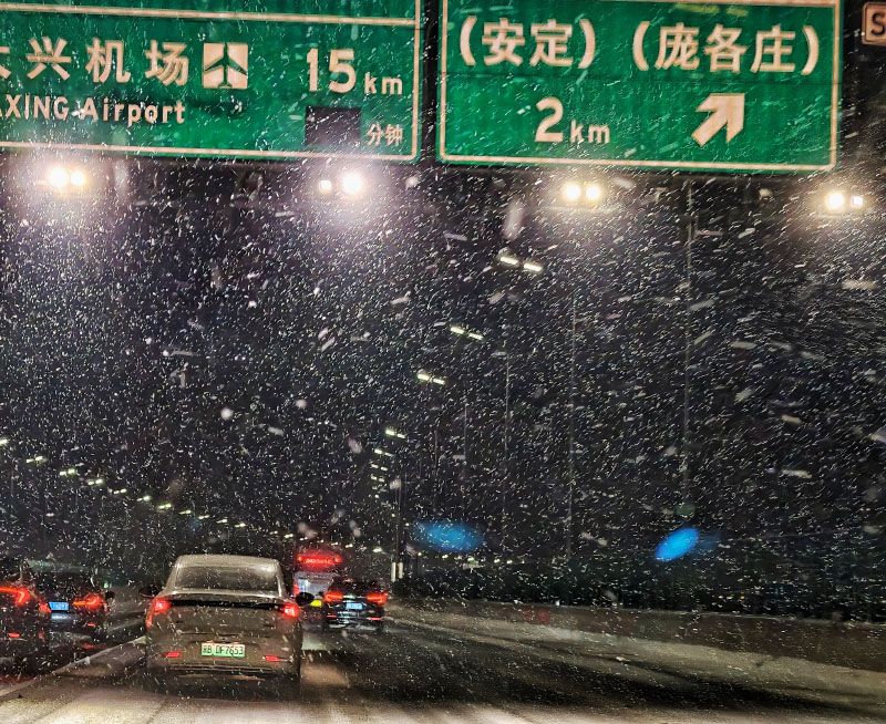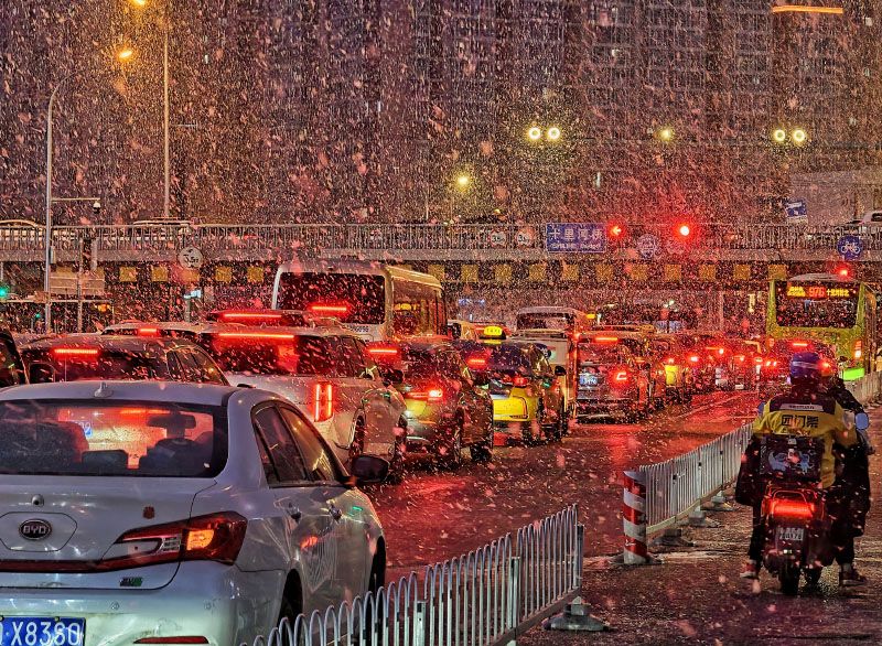 1月17日17時(shí)許,北京十里河,受降雪影響,車(chē)輛行駛緩慢。北京市氣象臺(tái)17日17時(shí)發(fā)布,今天傍晚至夜間陰有小到中雪,西部沿山局地大雪,東轉(zhuǎn)北風(fēng)二級(jí)左右,最低氣溫-7℃;明天白天小雪轉(zhuǎn)陰,偏北風(fēng)二三級(jí),山區(qū)陣風(fēng)六級(jí),最高氣溫-4℃。道路結(jié)冰黃色和持續(xù)低溫黃色預(yù)警中,請(qǐng)注意防寒防凍和出行安全。