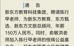 據(jù)新京報報道,1月20日,俞敏洪個人賬號發(fā)布通告:新東方教育科技集團,聘請陳行甲老師,為新東方教育、東方甄選、新東方文旅總顧問,年薪150萬元人民幣。