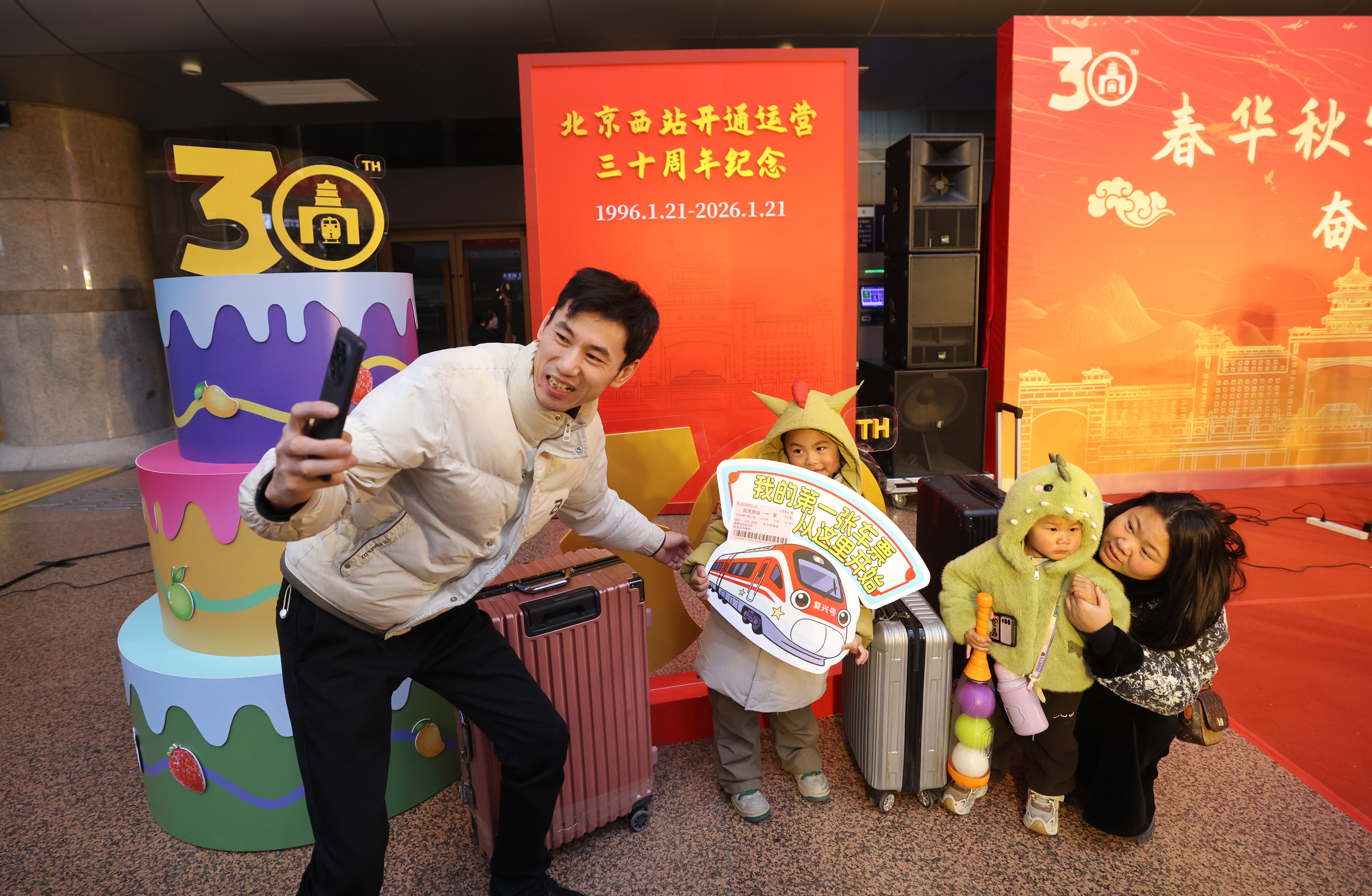 2026年1月21日,北京西站迎來開通運營三十周年,這座被譽為“京西門戶”的現(xiàn)代化鐵路交通樞紐已累計服務旅客超過19.6億人次。圖為旅客在打卡點合影留念。