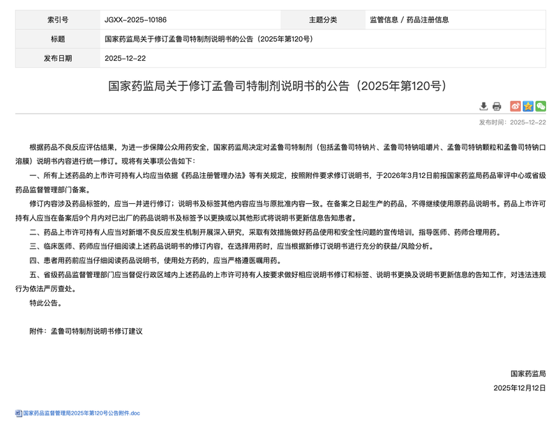 2025年12月22日,國家藥監(jiān)局發(fā)布公告,要求在孟魯司特制劑說明書中統(tǒng)一增加警示語,提示在各年齡段患者中均報告了神經精神不良反應。 圖源:國家藥監(jiān)局官網