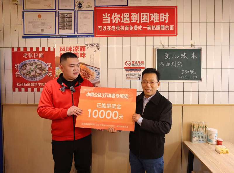 今天(1月22日),在北京朝外街道日壇北路的老張拉面館,店長(zhǎng)成奶倉(cāng)收到了公益組織頒發(fā)的1萬(wàn)元獎(jiǎng)金,這筆獎(jiǎng)金是對(duì)他7年來(lái)為有困難的人免費(fèi)提供一碗拉面善舉的肯定。成奶倉(cāng)已經(jīng)對(duì)這筆愛(ài)心獎(jiǎng)金做好了打算,折算成520碗拉面,提供給遇到困難的人,將這份愛(ài)傳遞下去。