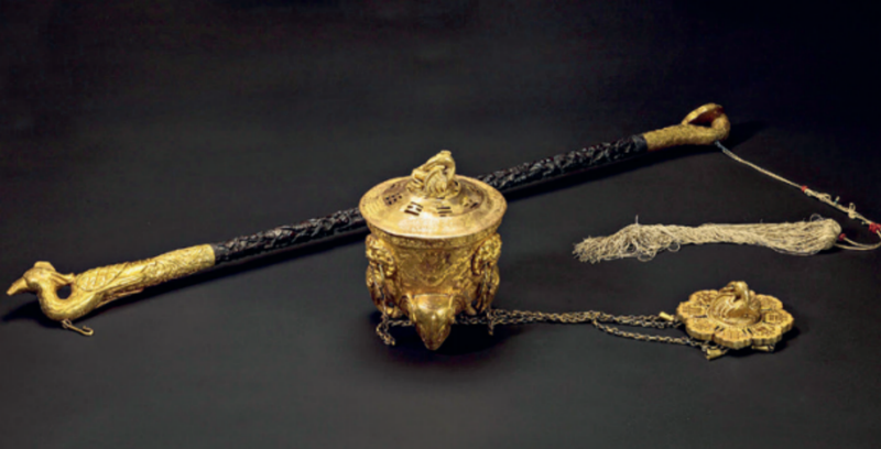 金鑲木柄金提爐,清代,故宮博物院藏?!断阌鲋袊褐腥A香史五千年》插圖
