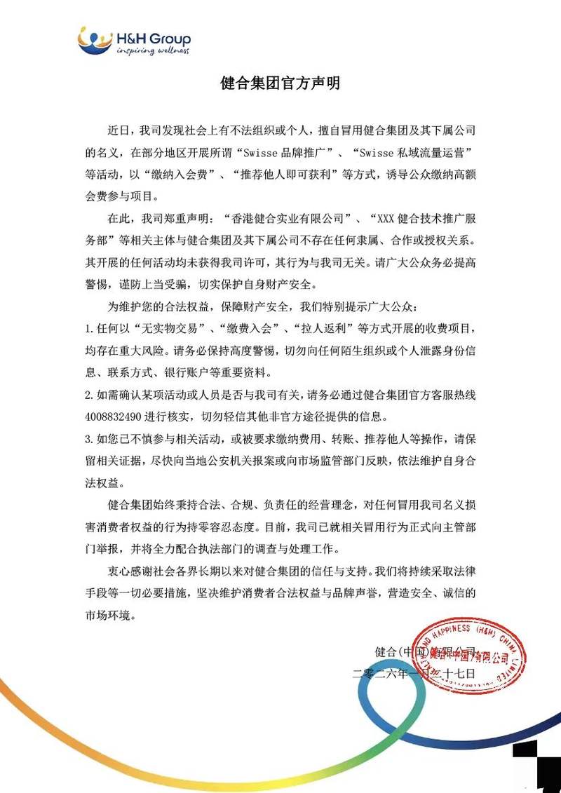 新京報訊(首席記者郭鐵)1月27日,港股上市營養(yǎng)品公司健合集團發(fā)布聲明稱,公司發(fā)現(xiàn)有不法組織或個人,擅自冒用健合集團及其下屬公司的名義,在部分地區(qū)開展所謂“Swisse品牌推廣”、“Swisse私域流量運營”等活動,以“繳納入會費”、“推薦他人即可獲利”等方式,誘導公眾繳納高額會費參與項目。