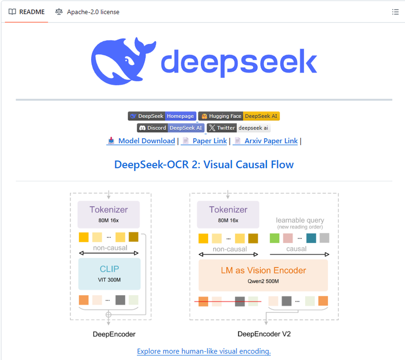 在此背景下,DeepSeek-OCR 2的核心創(chuàng)新在于提出“視覺因果流”機(jī)制,使模型不再機(jī)械地按像素順序處理圖像,而是根據(jù)語義和邏輯關(guān)系動態(tài)組織視覺信息。在具體實現(xiàn)上,模型在視覺編碼階段引入語義與因果感知能力,通過改進(jìn)的視覺編碼器,對不同視覺單元之間的依賴關(guān)系進(jìn)行建模,判斷哪些信息在理解上具有先行性,哪些內(nèi)容是對前者的補充或延展。