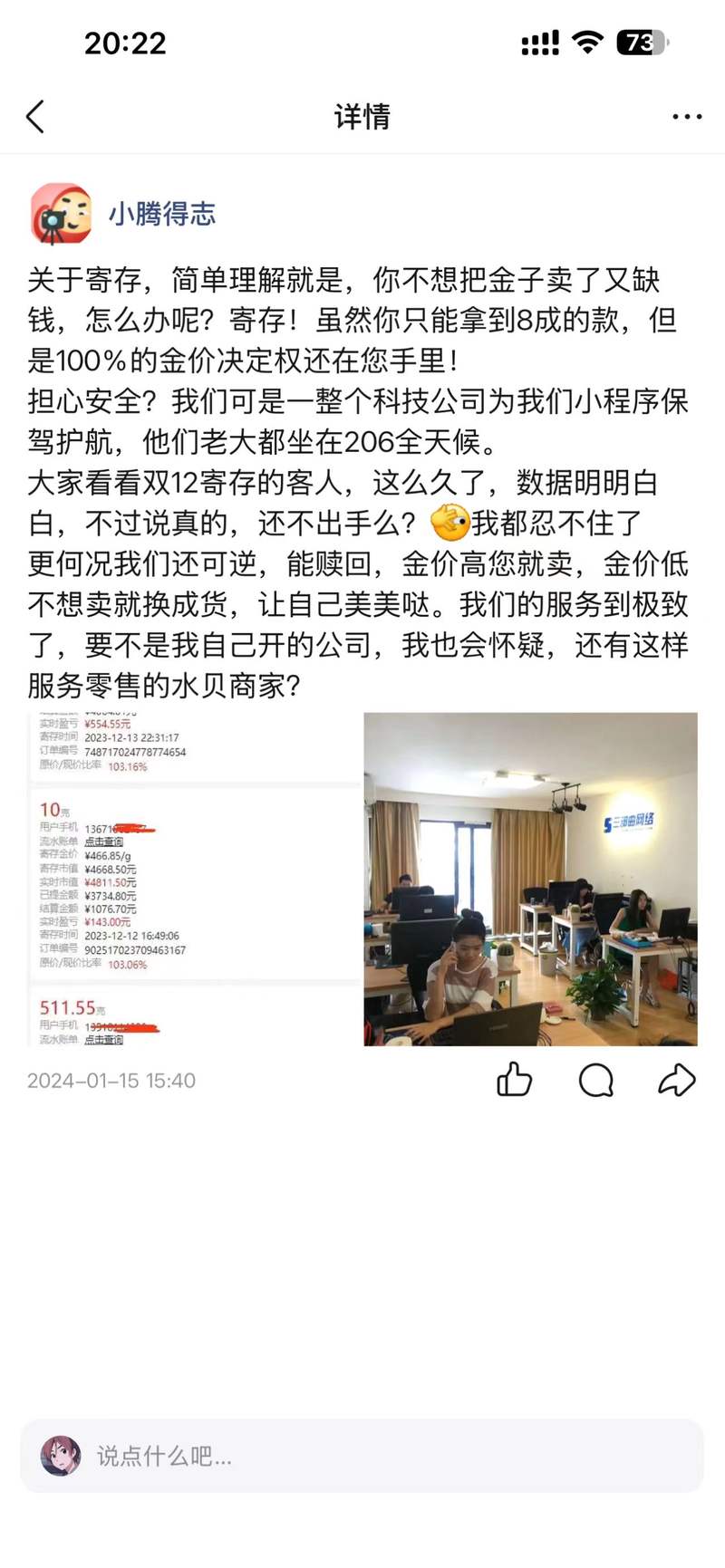杰我睿負責人張志騰曾在微信推廣時表示,“雖然你只能拿到八成款,但是100%的金價決定權還在你手中”。