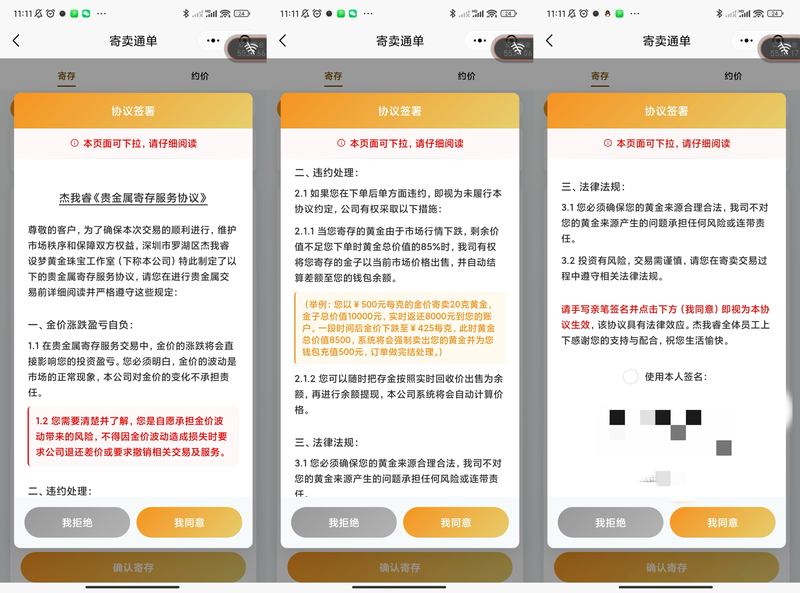 陳女士所說的“寄存”,實際上是杰我睿的“寄賣通單”業(yè)務。其中,“寄存”是“寄賣通單”的主要業(yè)務之一。根據(jù)杰我?!顿F金屬寄存服務協(xié)議》,消費者寄存時按實時回收價出售,并只能拿到80%的款項。而消費者可以決定何時以市場價出售或按照寄存時的回收價贖回。但若黃金價格不足下單時總價值的85%,杰我睿將強制平倉。這單業(yè)務結束時,結余資金將返還給消費者。