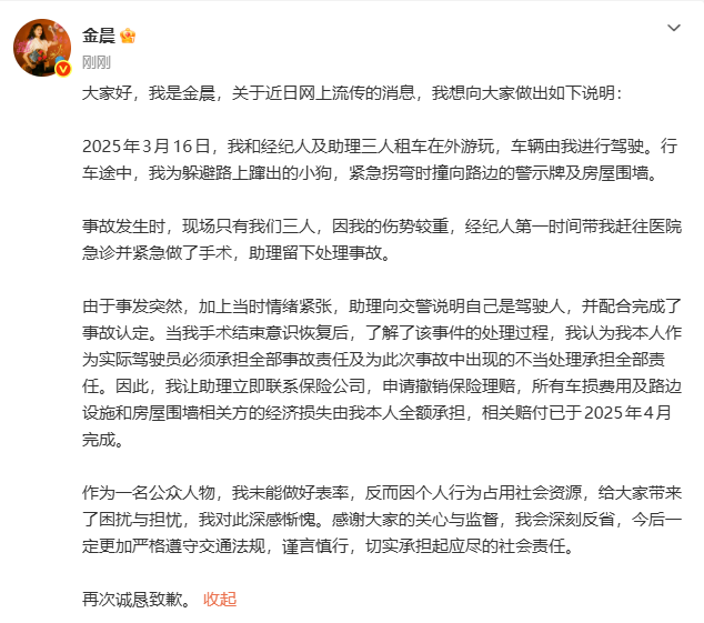 由于事發(fā)突然,加上當(dāng)時情緒緊張,助理向交警說明自己是駕駛?cè)耍⑴浜贤瓿闪耸鹿收J(rèn)定。當(dāng)我手術(shù)結(jié)束意識恢復(fù)后,了解了該事件的處理過程,我認(rèn)為我本人作為實(shí)際駕駛員必須承擔(dān)全部事故責(zé)任及為此次事故中出現(xiàn)的不當(dāng)處理承擔(dān)全部責(zé)任。因此,我讓助理立即聯(lián)系保險(xiǎn)公司,申請撤銷保險(xiǎn)理賠,所有車損費(fèi)用及路邊設(shè)施和房屋圍墻相關(guān)方的經(jīng)濟(jì)損失由我本人全額承擔(dān),相關(guān)賠付已于2025年4月完成。