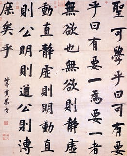 明代的書家如吳寬、宋克、沈粲、陳度、沈周、文徵明、祝允明及張瑞圖、徐渭等都很有名,徐渭的行草另有蹊徑,與畫同具特色。我們在這里只舉晚明大家董其昌的《周子通書》以見其例,董氏以其風(fēng)流飄灑的行書聞名于世,所以特選一正楷大幅,以見其功力之敦厚。