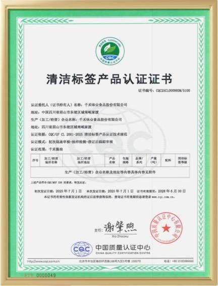 千禾味業(yè)清潔標簽產(chǎn)品0級認證證書。