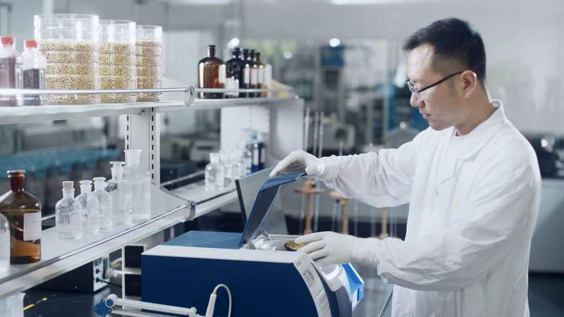 千禾味業(yè)技術人員正在實驗室為大豆原料進行指標檢測。